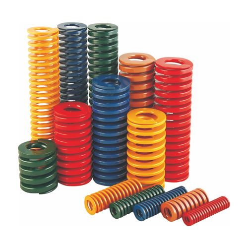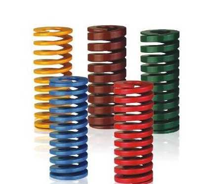 比如成型模、單沖模中的模具彈簧一般使用矩形模具彈簧中的棕色模具彈簧足夠,因為矩形模具彈簧通過顏色來進行區分力大小(五種:黃、藍、紅、綠、棕)。氮氣模具彈簧非常貴一般不用,而優力膠使用在模具彈簧箱結構或拉伸模、整形模等廉價模具中。